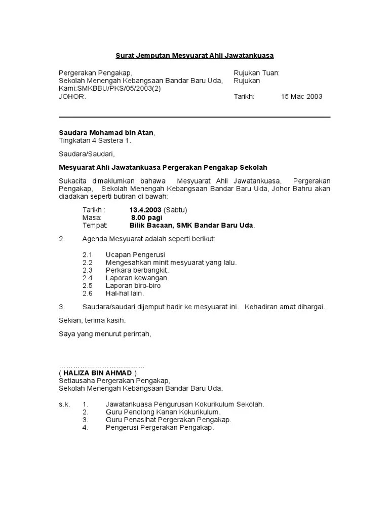 Kelab kembara dan rekreasi, ruj. Sekolah menengah kebangsaan bandar baru uda, . Contoh surat jemputan mesyuarat ahli jawatankuasa. Mesyuarat juga bersetuju untuk semua ahli kariah membuat. Contoh surat panggilan mesyuarat ajk.